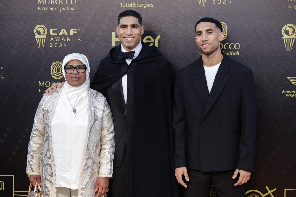 Paris Saint-Germain's Moroccan defender Achraf Hakimi (C) poses for a picture with members of his family as he arrives for the 2025 Confederation of African Football (CAF) Awards in Sale, Morocco on November 19, 2025. (Photo by Abdel Majid Bziouat / AFP