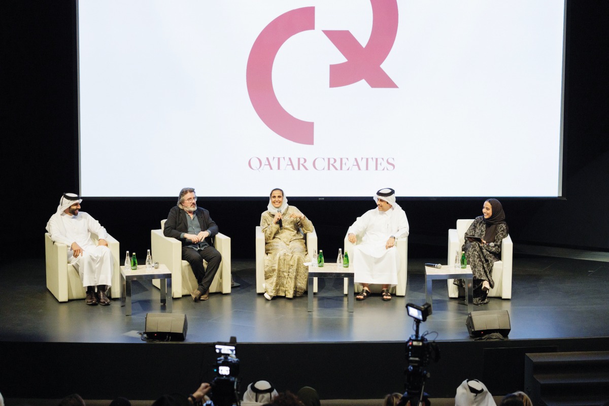 H E Sheikha Al Mayassa bint Hamad bin Khalifa Al Thani (center), Chairperson of Qatar Museums, artist Olafur Eliasson (second left), and others at a panel discussion on 'The Curios Desert' exhibit.