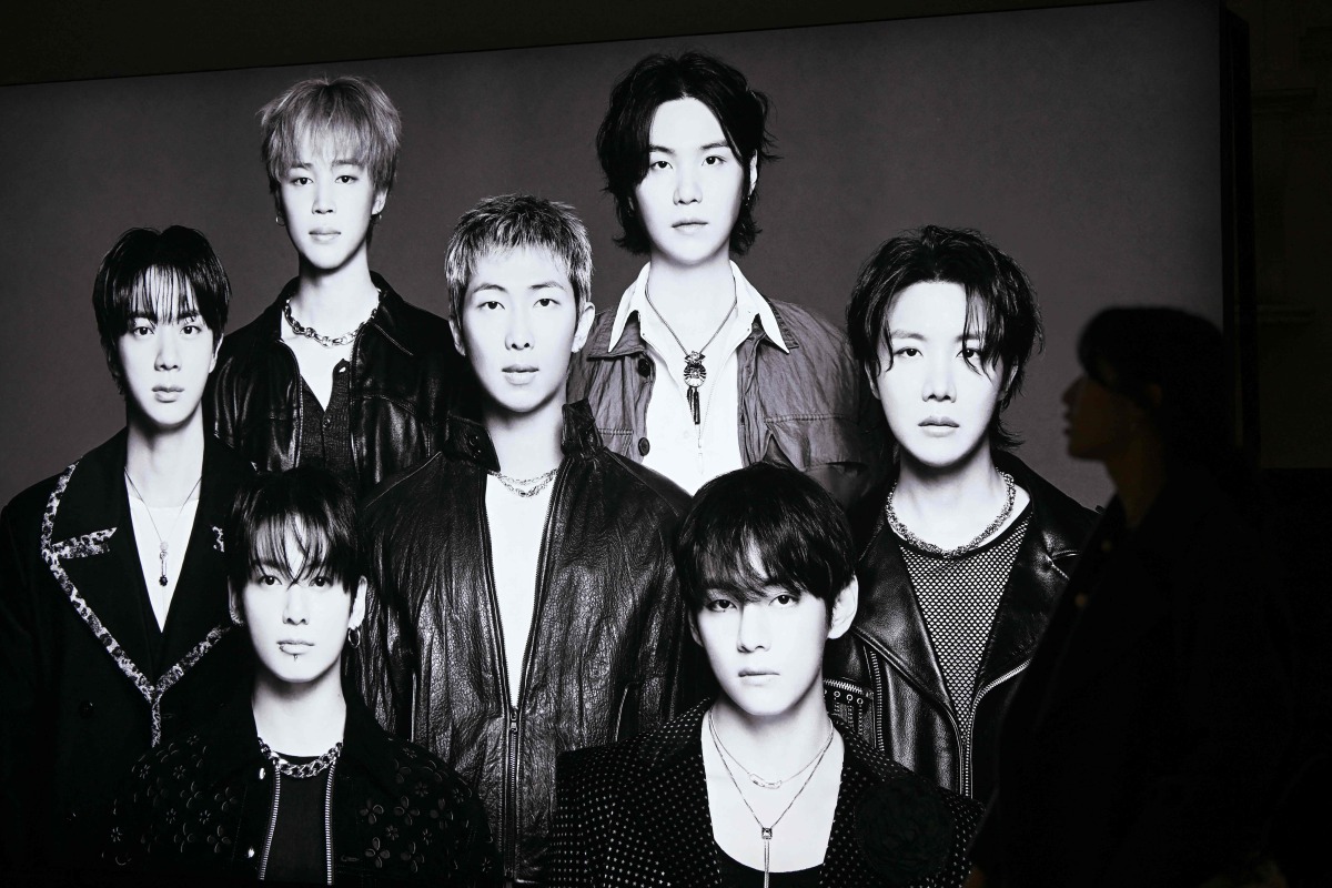 A visitor walks past a BTS photo displayed at a BTS pop-up store at Shinsegae Department Store's The Heritage in Seoul on March 20, 2026. Photo by Jung Yeon-je / AFP