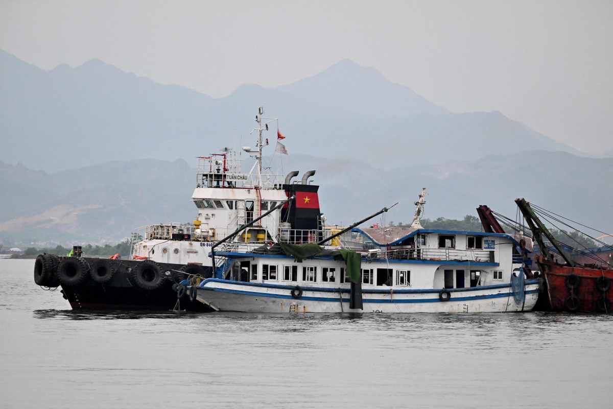 The tourist boat (front L) that capsized is towed back to the port in Ha Long bay, Quang Ninh province on July 20, 2025. Photo by Nhac NGUYEN / AFP
