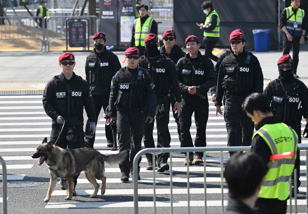 South Korean Police's Special Operations Unit members inspect with a sniffer police dog at Gwanghwamun Square in downtown Seoul on March 21, 2026. (Photo by Jung Yeon-je / AFP)