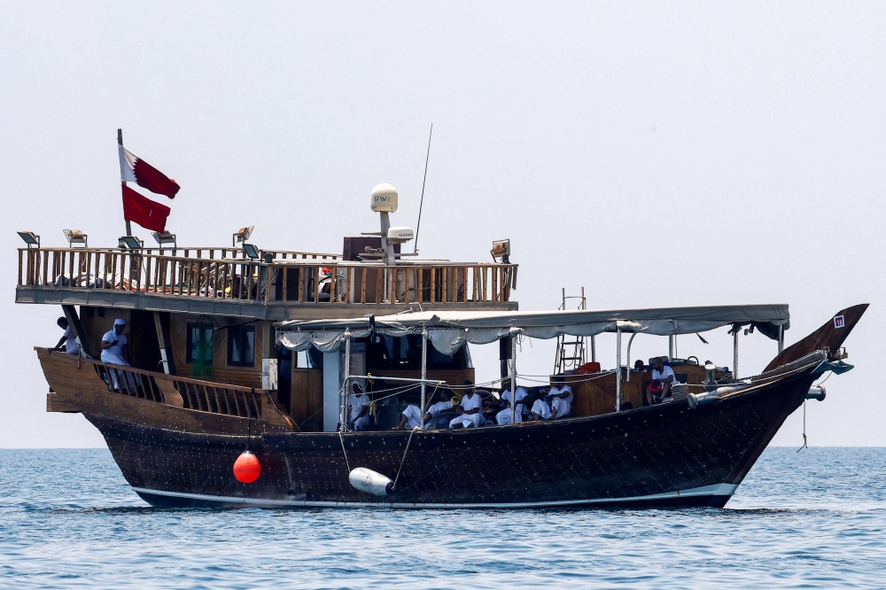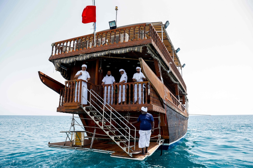 Participants aboard a traditional dhow boat during the hand-line fishing competition of the Senyar Festival off of Sealine south of Doha on April 21, 2025. (Photo by Karim Jaafar / AFP)