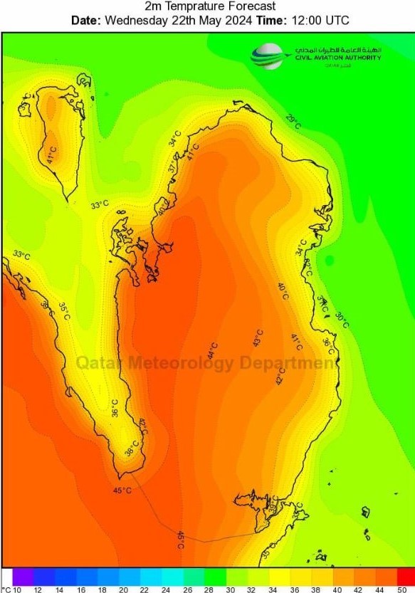 The maximum temperature of 45°C is predicted for Abu Samra area. In Doha, the temperature tomorrow is expected to range between 31°C and 41°C.