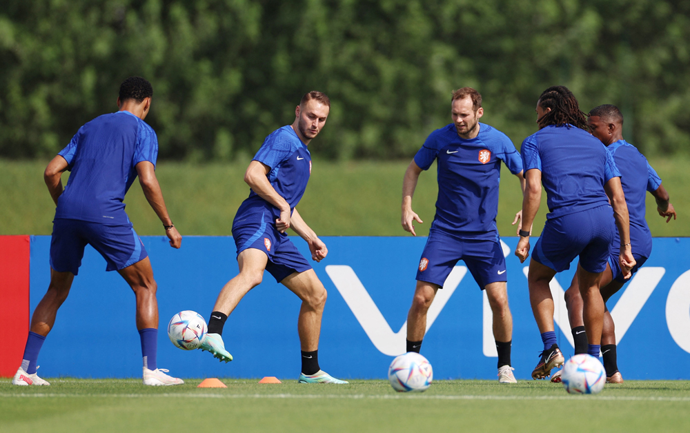 Netherlands’ Teun Koopmeiners and Daley Blind with team-mates during a training session. REUTERS