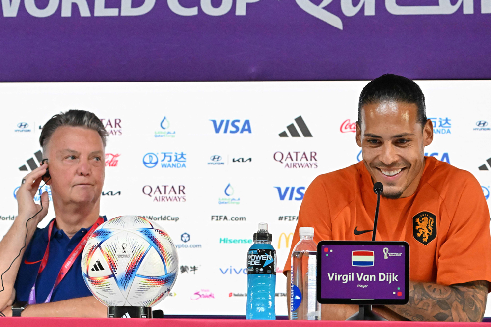 Netherlands’ Virgil van Dijk (right) and coach Louis Van Gaal. AFP
