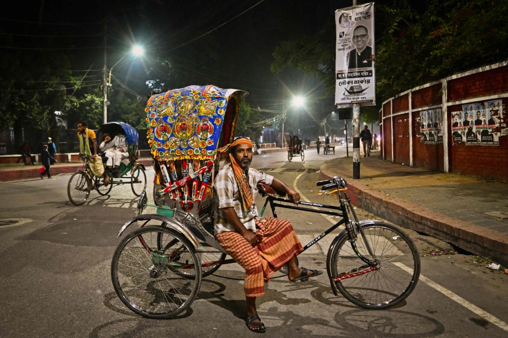 This photograph taken on December 13, 2023 shows a bicycle rickshaw adorned with colourful artwork depicting film actors, in Dhaka. (Photo by Munir Uz Zaman / AFP)