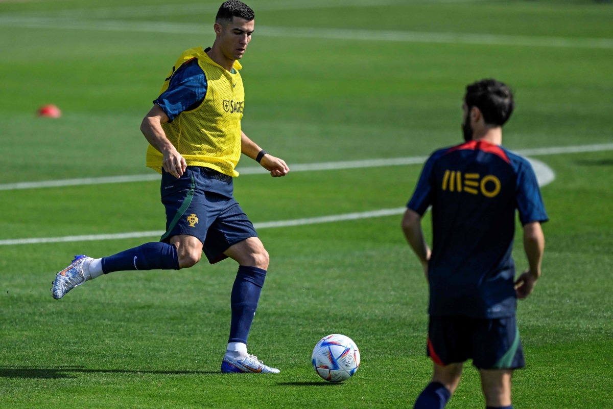 Portugal’s forward Cristiano Ronaldo takes part in a training session at Shahaniya Sports Club yesterday.