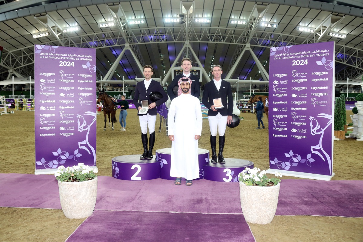 The podium winners of CSI 5* - 1.50m feature event were honoured by Sport Director CHI Al Shaqab Presented by Longines Khalid Sanad. Pictures: CHI Al Shaqab Presented by Longines.