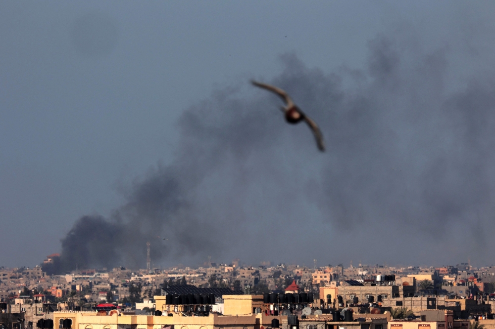 A bird flies over Rafah as smoke billows following Israeli bombardment of Khan Yunis in the southern Gaza Strip on February 21, 2024, amid continuing battles between Israel and the Palestinian militant group Hamas. (Photo by Mohammed Abed / AFP)