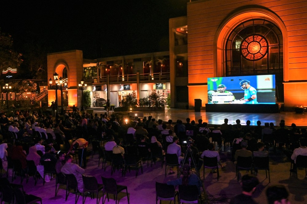 Cricket fans watch a live broadcast of the ICC Champions Trophy one-day international (ODI) cricket match between India and Pakistan in Dubai, on a big in Karachi on February 23, 2025. (Photo by Asif Hassan / AFP)