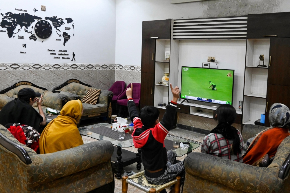 Cricket fans watch a live broadcast of the ICC Champions Trophy one-day international (ODI) cricket match between Pakistan and India in Dubai, on a television set inside a house in Peshawar on February 23, 2025. (Photo by Abdul Majeed / AFP)