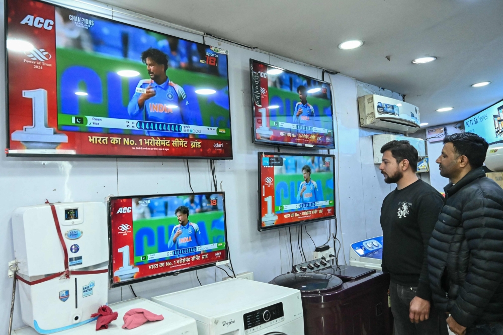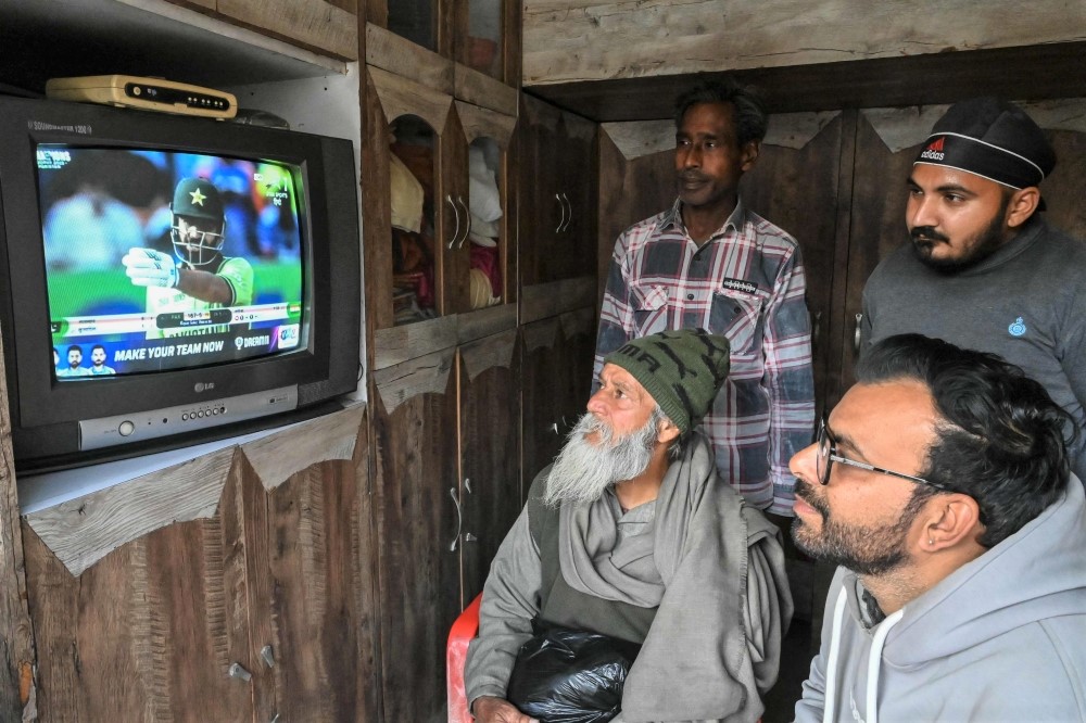 People watch a live broadcast at a shop in Amritsar on February 23, 2025, screening the ICC Champions Trophy one-day international (ODI) cricket match between Pakistan and India in Dubai. (Photo by Narinder Nanu / AFP)