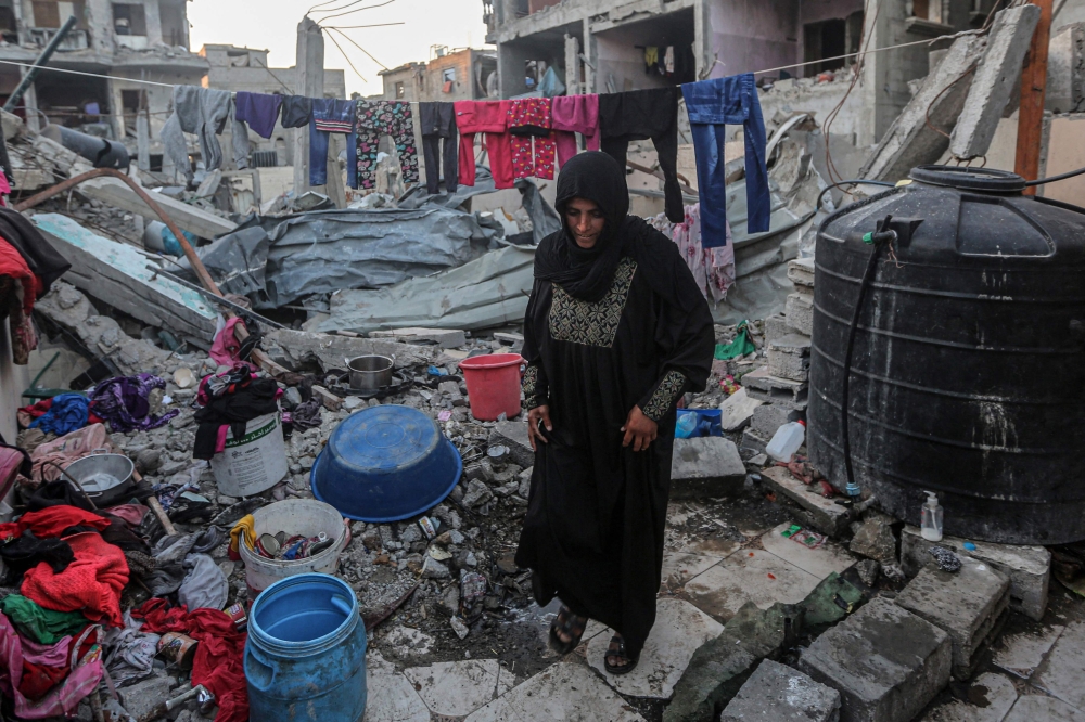:A woman hangs laundry amidst the rubble of the Rabaya home, which was destroyed by an Israeli strike, during the Muslim holy month of Ramadan in Rafah on March 23, 2024. (Photo by SAID KHATIB / AFP)