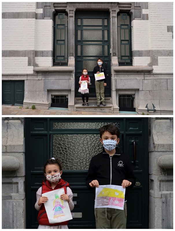 Marie Lou Belenyesi, 4, and Paolo Belenyesi, 9, pose for a photograph while holding pictures that they drew during the coronavirus disease (COVID-19) outbreak, as they stand by the entrance to their home in Brussels, Belgium, April 19, 2020. Reuters/Johanna Geron