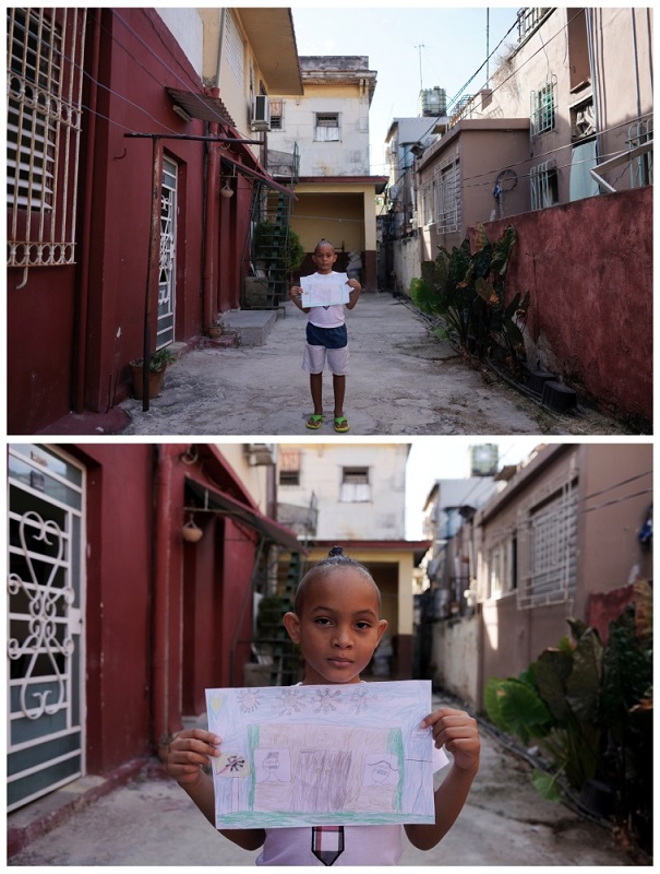 Combination picture showing Cristofer Lucas Reyes, 7, posing for a photograph while holding a picture that he drew during the coronavirus disease (COVID-19) outbreak, as he stands in front of his home in Havana, Cuba, April 20, 2020. REUTERS/Alexandre Meneghini