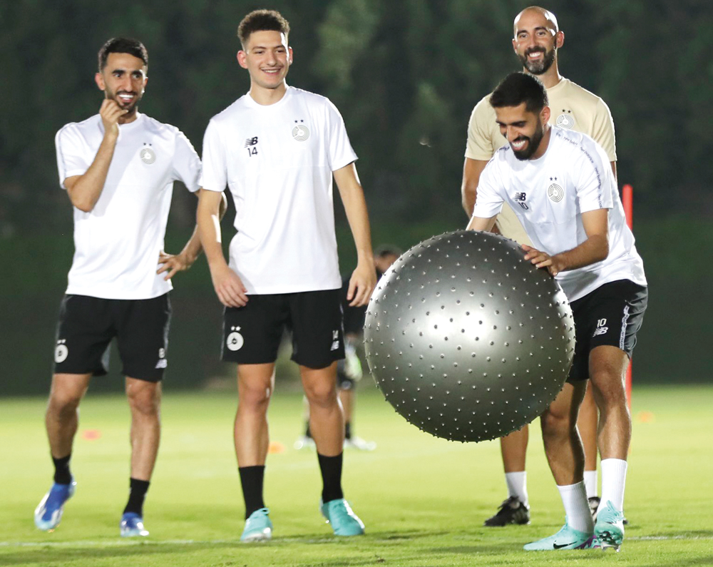 Al Sadd's captain Hassan Al Haydos with teammates during a training session.