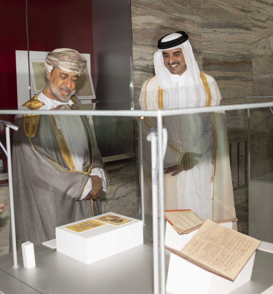 After that, HH the Amir and HM Sultan of Oman visited Qatar National Library, during which they listened to an explanation about the librarys contents from Arab and international sources of knowledge in various sciences, manuscripts, arts, cultures and the history of the region, especially the Heritage Library and the rare manuscripts and old editions it includes that narrate the history of Qatar, the region and the world, in addition to an explanation about the library building, which reflects the library's vision and message of knowledge.