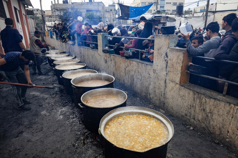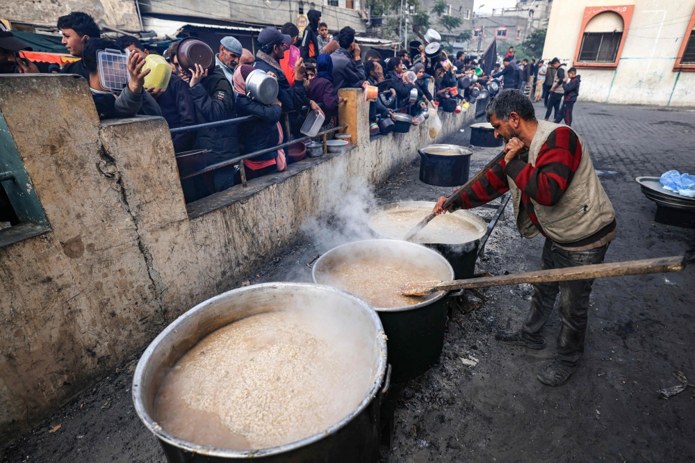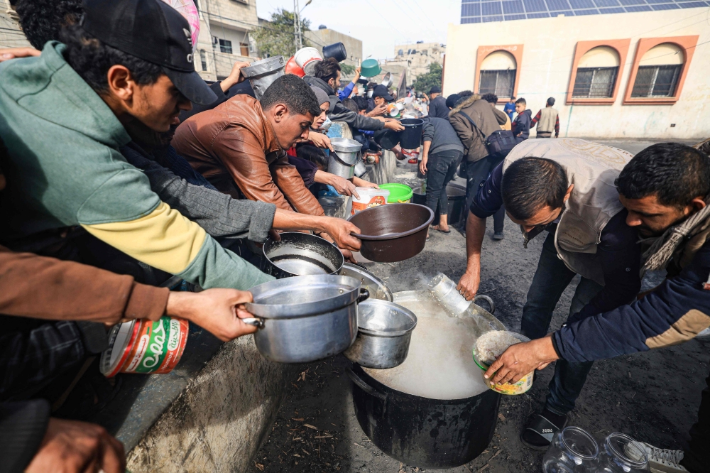 At a donation point in a refugee camp in in Rafah in the southern Gaza Strip, Palestinian men and children line up to collect food on December 23, 2023.