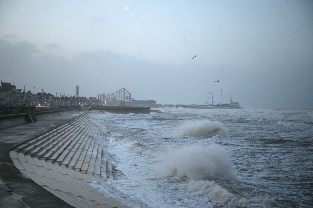 Waves crash onto the Promenade wall in Blackpool, north-west England in the morning of January 24, 2025. Photo by Oli Scarff/ AFP