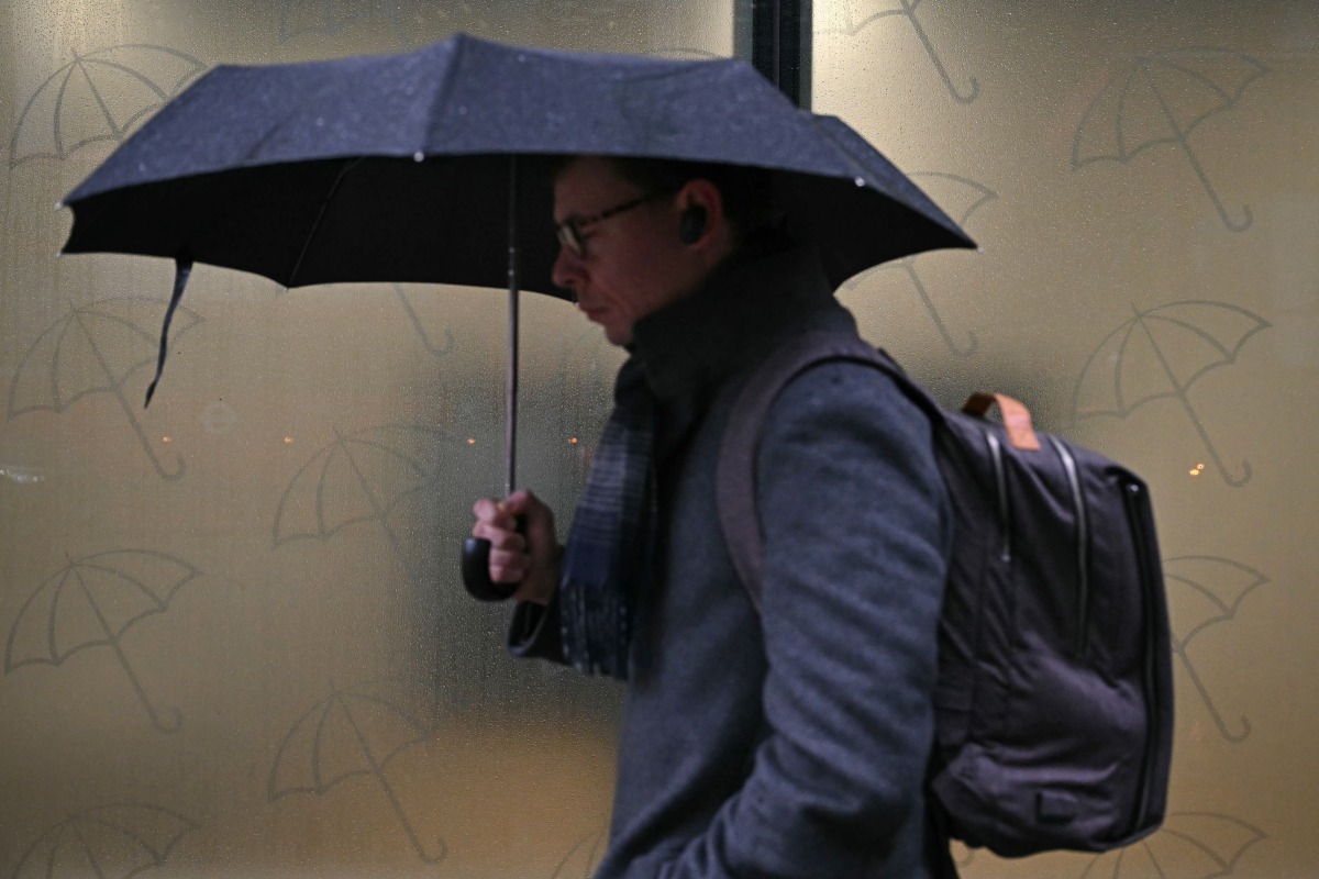 A commuter shelters from the rain under an umbrella in the city of London, early in the morning of January 24, 2025. Photo by Ben Stansall/ AFP