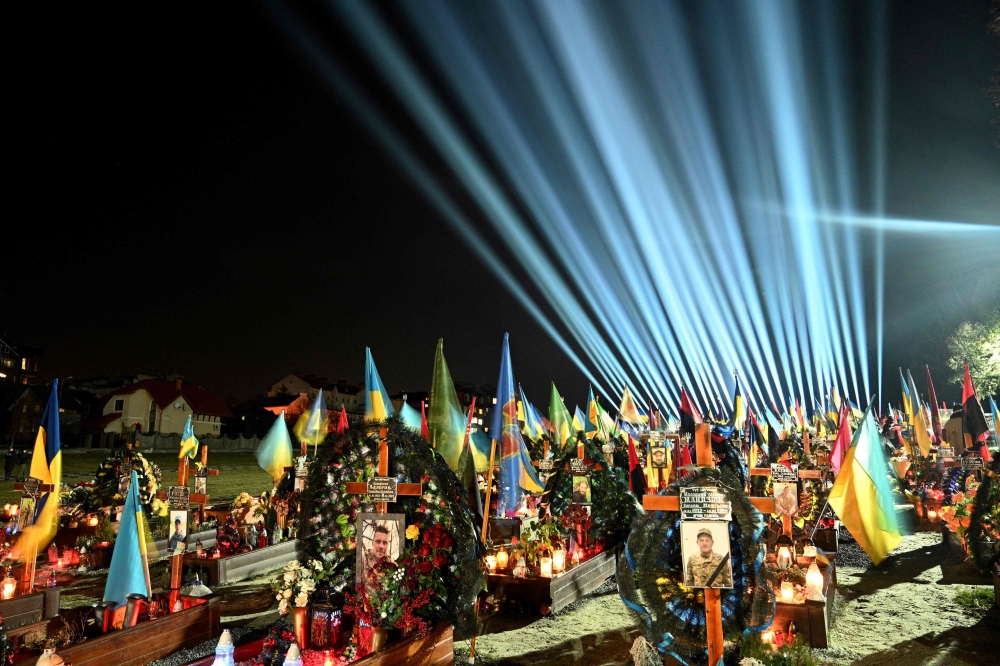 This photograph shows a symbolic illumination called "ray of memory" over the graves of Ukrainian soldiers who died in the war with Russia at Lychakiv Cemetery in Lviv on February 23, 2023, on the eve of the first anniversary of Russia's invasion of Ukraine. (Photo by Yuriy Dyachyshyn / AFP)