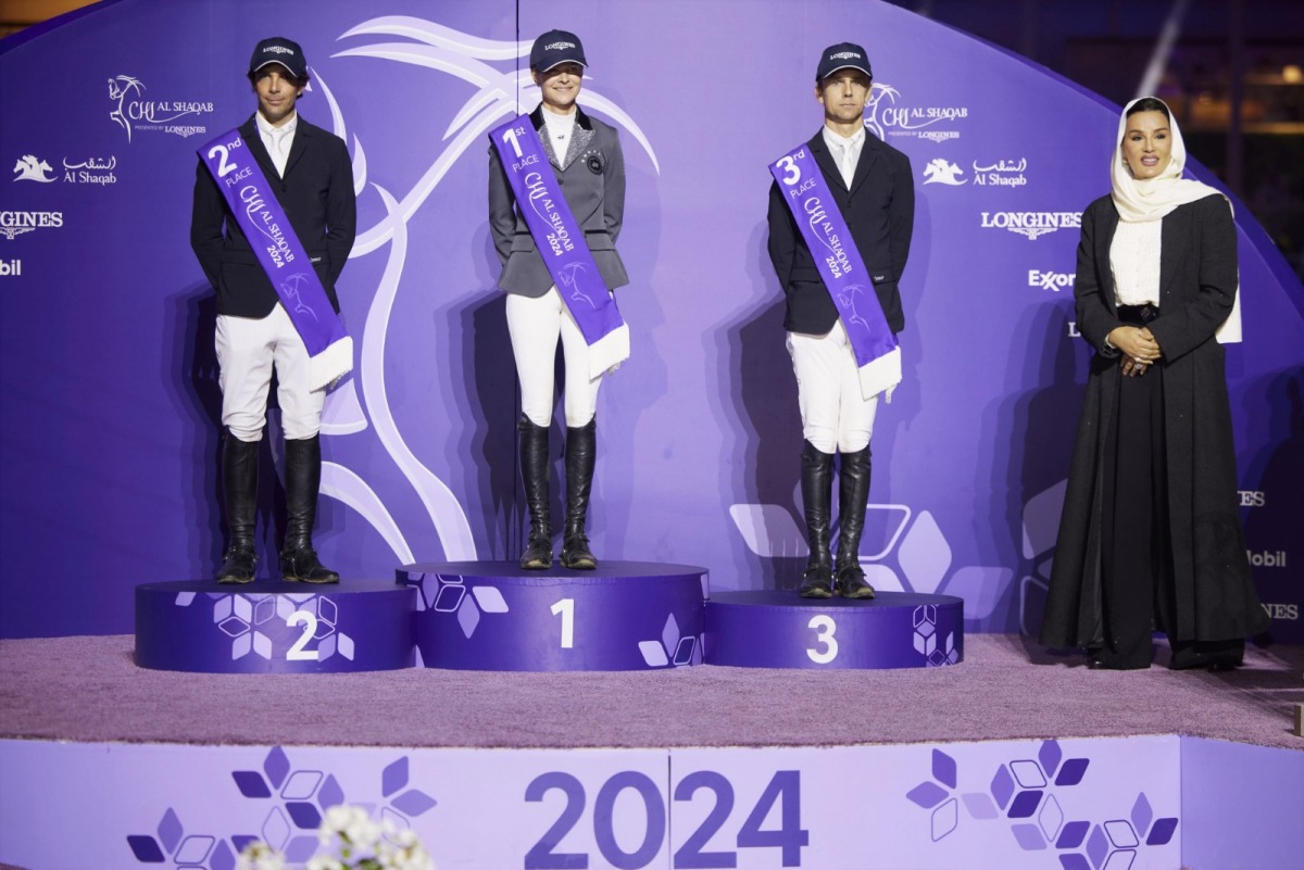 Chairperson of Qatar Foundation H H Sheikha Moza bint Nasser crowned the podium winners of the CHI Al Shaqab - Grand Prix presented by Longines on the final day of the three-day CHI Al Shaqab equestrian extravaganza yesterday. Sweden’s Malin Baryard-Johnsson won the title while Spain’s Eduardo Alvarez Aznar and Belgium’s Wilm Vermeir claimed second and third positions respectively at Al Shaqab’s Longines Outdoor Arena.