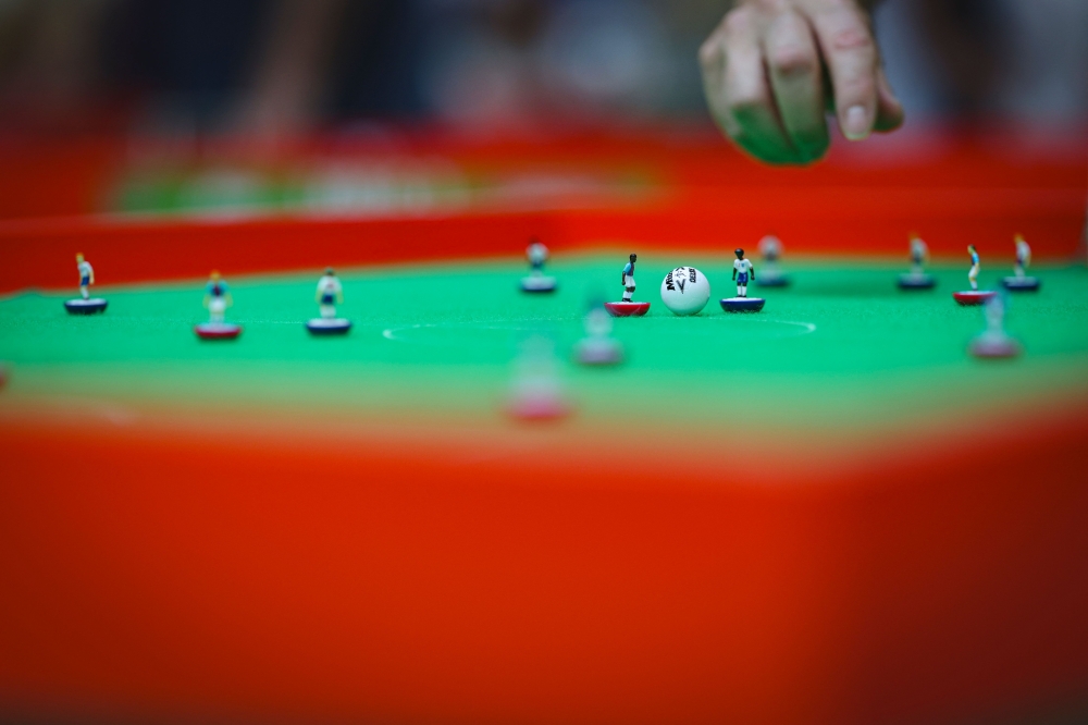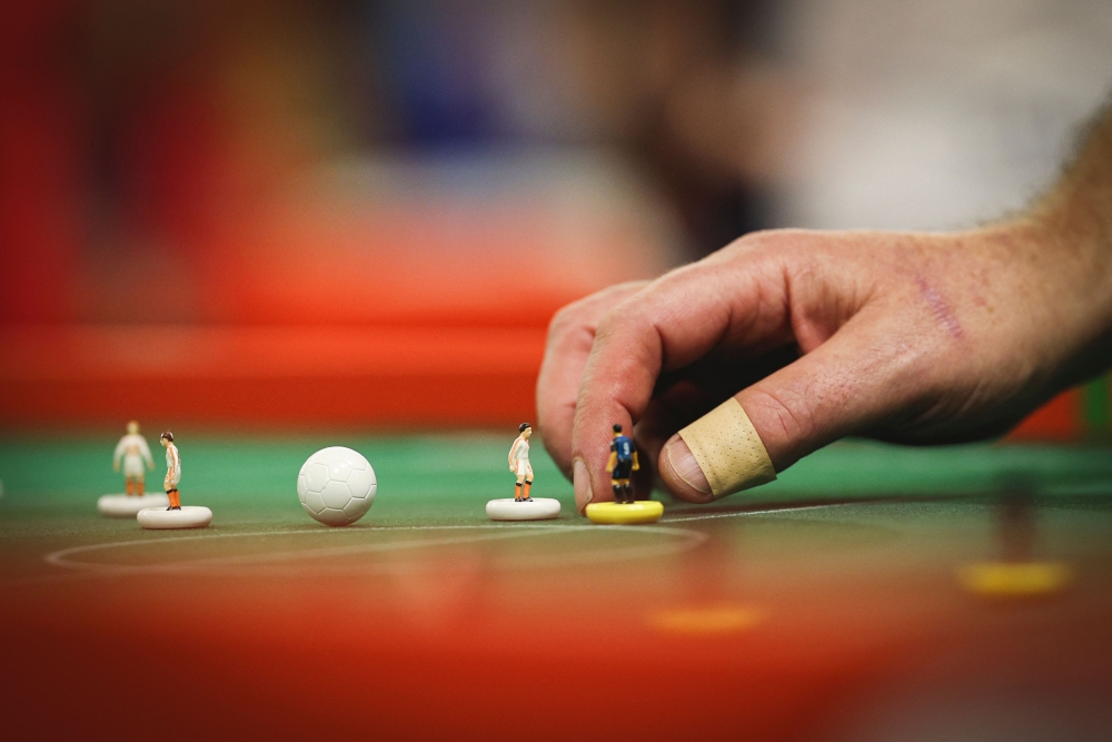 This is achieved by flicking the tiny players, who either have a flat or semi-circular base, into the ball and manoeuvering it into goalscoring positions.
