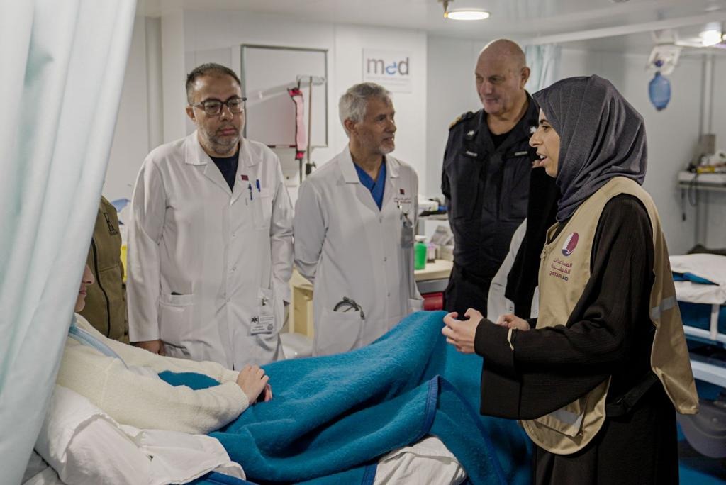 Al Arish: Minister of State for International Cooperation at the Ministry of Foreign Affairs HE Lolwah bint Rashid Al Khater and the accompanying delegation checked on the wounded Palestinian brethren who are receiving treatment with the assistance of the Qatari Armed Force's medical staff 'duty troop' on the Italian Navy hospital ship "Volcano" in Al Arish port.