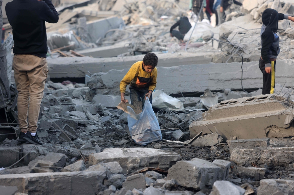 Palestinians look for salvageable items amid the rubble of a building destroyed in Israeli bombardment in Rafah in the southern Gaza Strip on January 25, 2024.