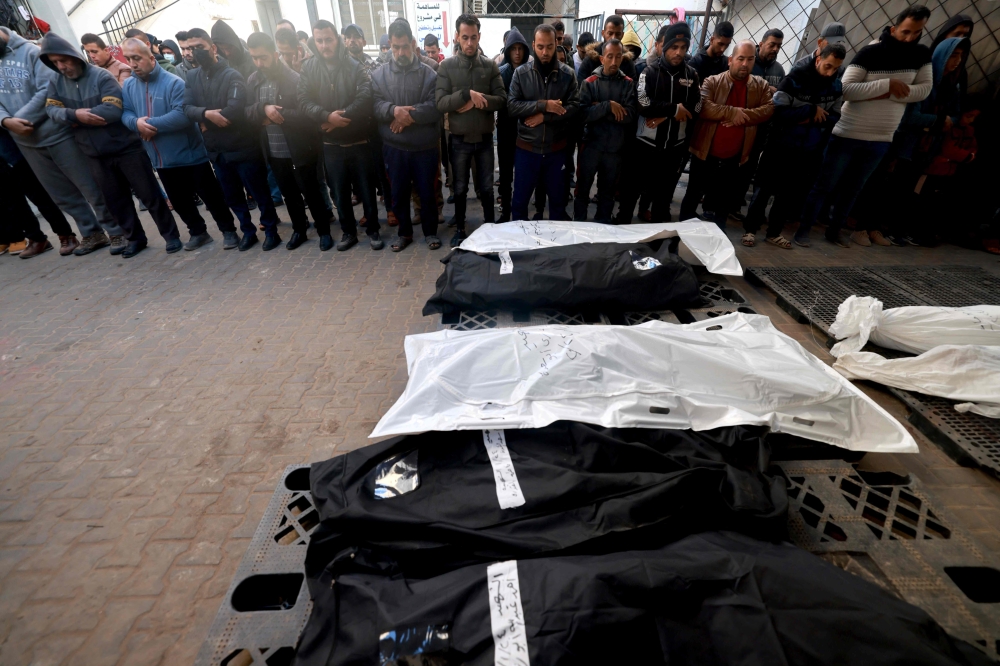 Palestinians pray before bodies of relatives killed in the latest bombardment of Khan Yunis and Rafah outside Najjar hospital in Rafah before a group burial on January 25, 2024.