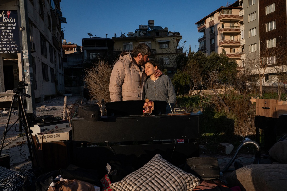 Veli and Yesim Bagi were the exception. Their couch looked out of place, their clean, purposefully arranged belongings sat starkly against the rubble. They waited on the long, quiet road, their music store behind them, facing a once-pristine park.