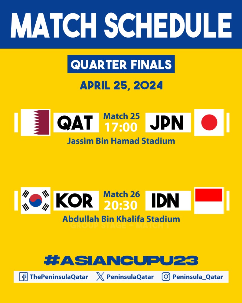 The second quarter-final today will see debutants Indonesia meeting South Korea at Abdullah Bin Khalifa Stadium.