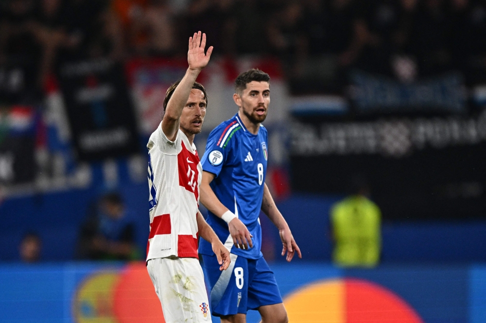 Croatia's midfielder #10 Luka Modric and Italy's midfielder #08 Jorginho react during the UEFA Euro 2024 Group B football match between Croatia and Italy at the Leipzig Stadium in Leipzig on June 24, 2024. (Photo by GABRIEL BOUYS / AFP)