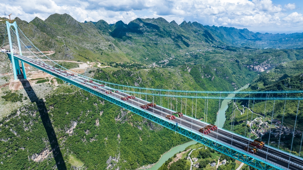 The Huajiang Grand Canyon Bridge, set to become the world's tallest bridge, had completed a key load test on August 25, 2025 ahead of its scheduled opening in late September.(Photo by Chen Xi/Xinhua)
