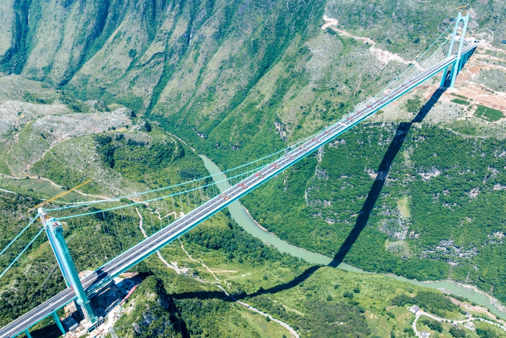Once open, the bridge will run 2,890 meters end to end, with its central span stretching 1,420 meters, making it the largest span bridge built in mountainous terrain worldwide. From deck to water it rises 625 meters -- a height that makes it the tallest bridge on Earth.