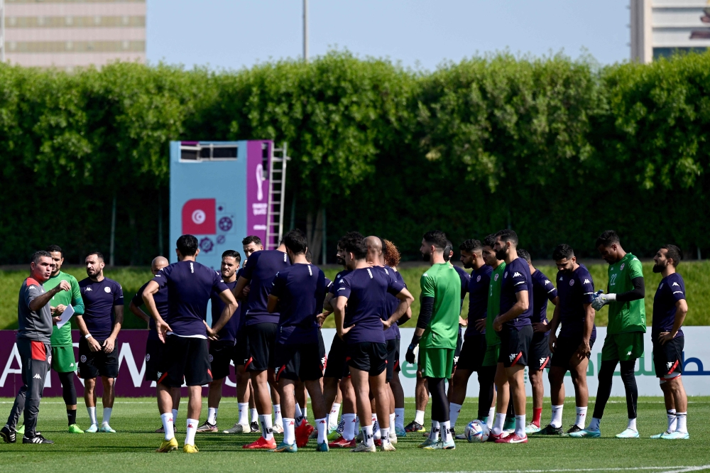 Tunisia's coach Jalel Kadri speaks to his players during a training session at the Al Egla training facility in Doha on November 25, 2022. (Photo by MIGUEL MEDINA / AFP)
