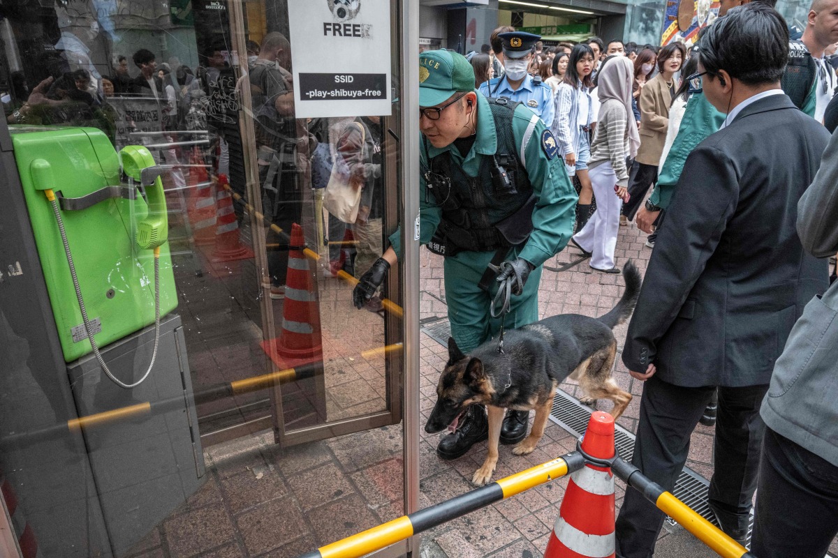 A police officer patrols with a police dog before an election campaign speech by Yoshihiko Noda, leader of the Constitutional Democratic Party (CDP), in front of Shibuya station in Tokyo on October 26, 2024. Photo by Yuichi YAMAZAKI / AFP