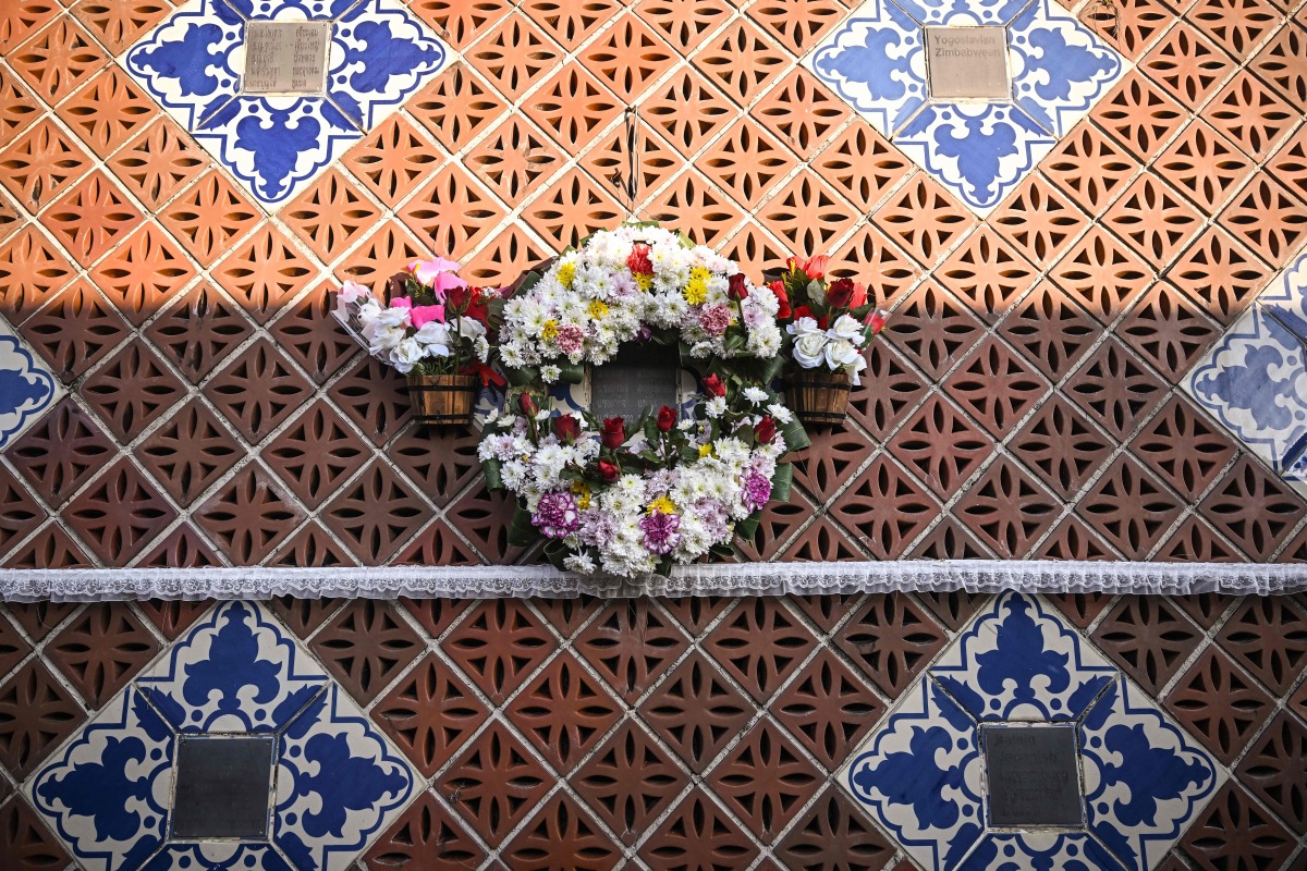 Flowers are left at the Ban Nam Khem Tsunami Memorial wall in southern Thai province of Phang Nga on December 26, 2024. Photo by Lillian SUWANRUMPHA / AFP