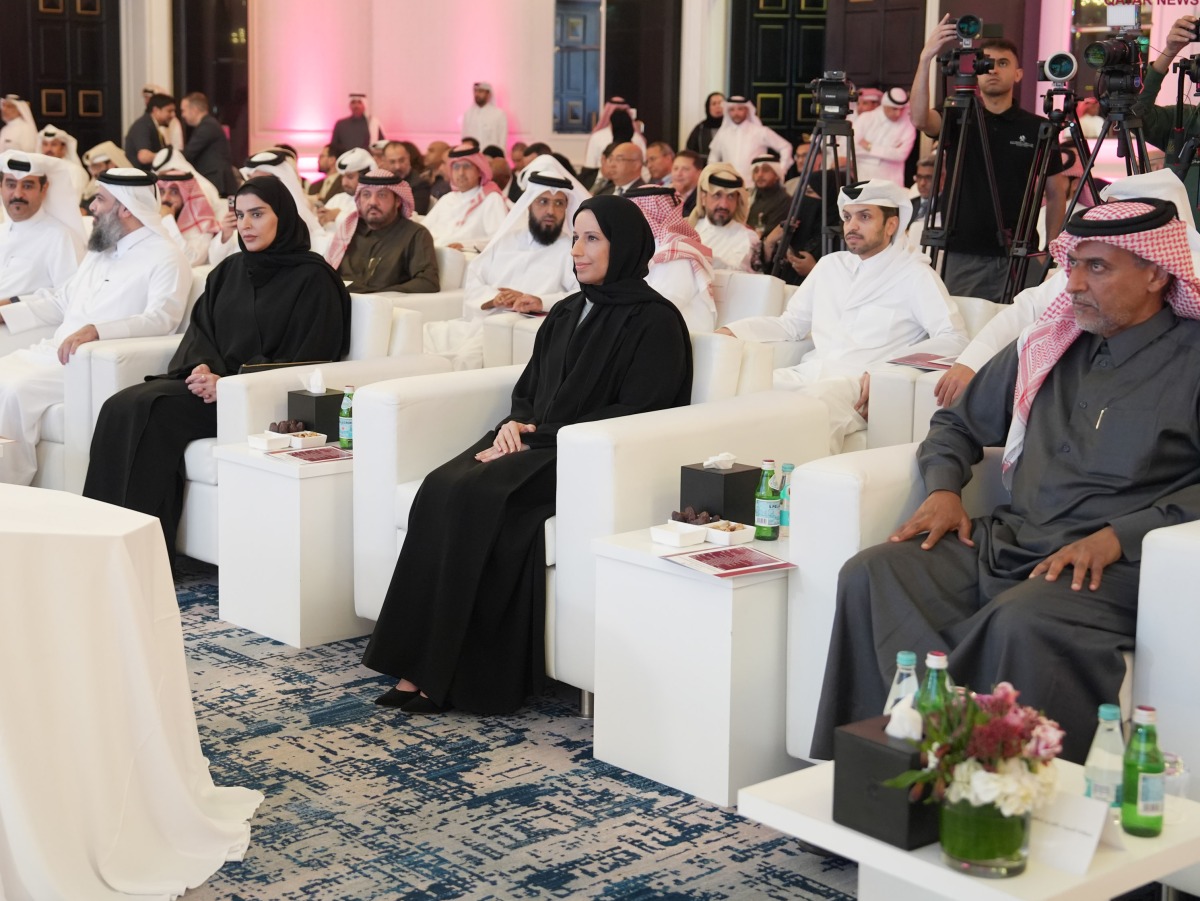Minister of Social Development and Family H E Buthaina bint Ali Al Jabr Al Nuaimi (second right) and Minister of State for International Cooperation H E Maryam bint Ali bin Nasser Al Misnad (third right) with other officials during inauguration the strategy for the charitable and humanitarian sector in Qatar 2025-2030, and the Domestic Aids Portal “SANADY”.