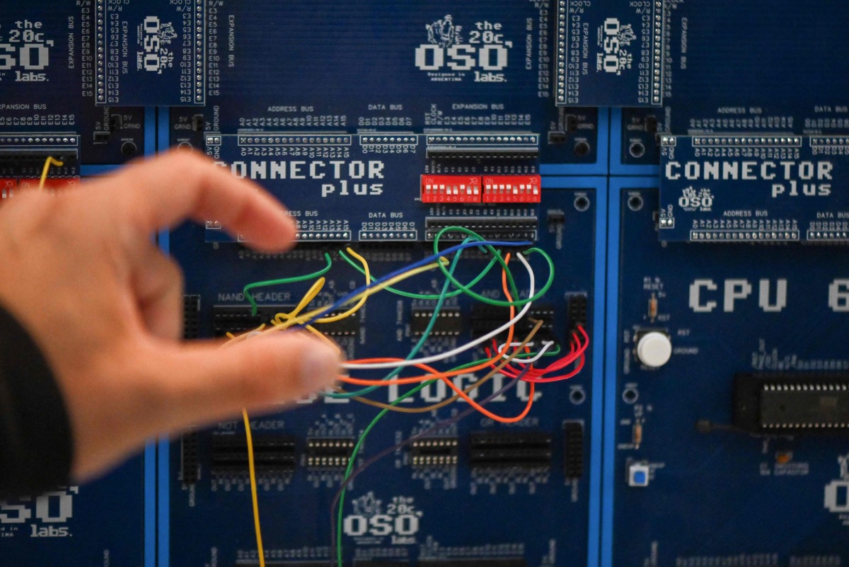 A man points to a recycled circuit that is part of a computer during the 3rd Federal Cyberciruja Meeting in Buenos Aires on August 16, 2025. Photo by Luis ROBAYO / AFP
