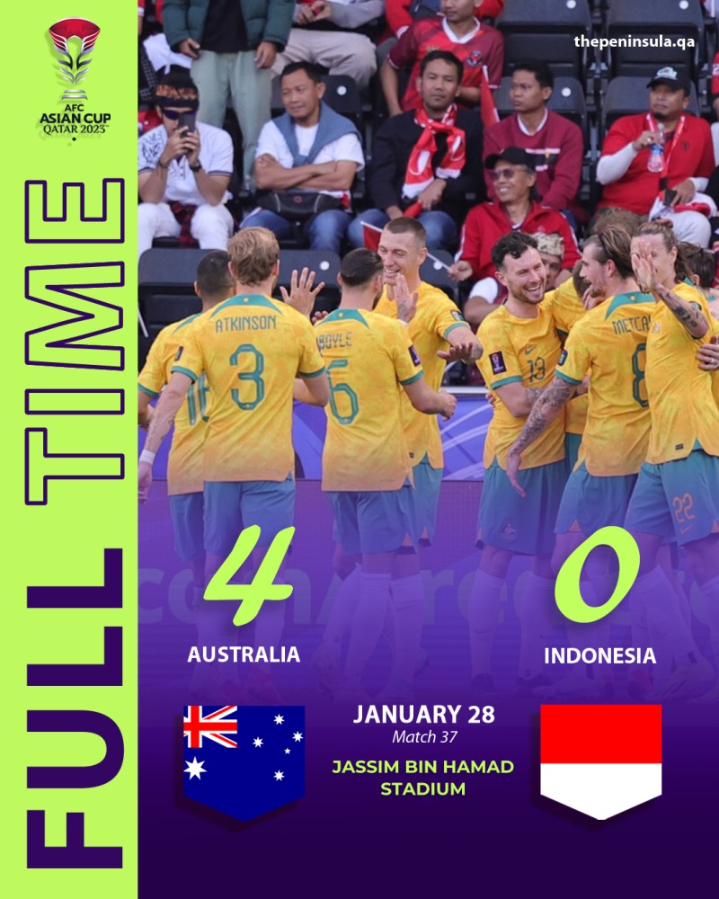 Australia set up a tasty Asian Cup quarter-final clash against South Korea or Saudi Arabia with a 4-0 win over a spirited but limited Indonesia on Sunday.