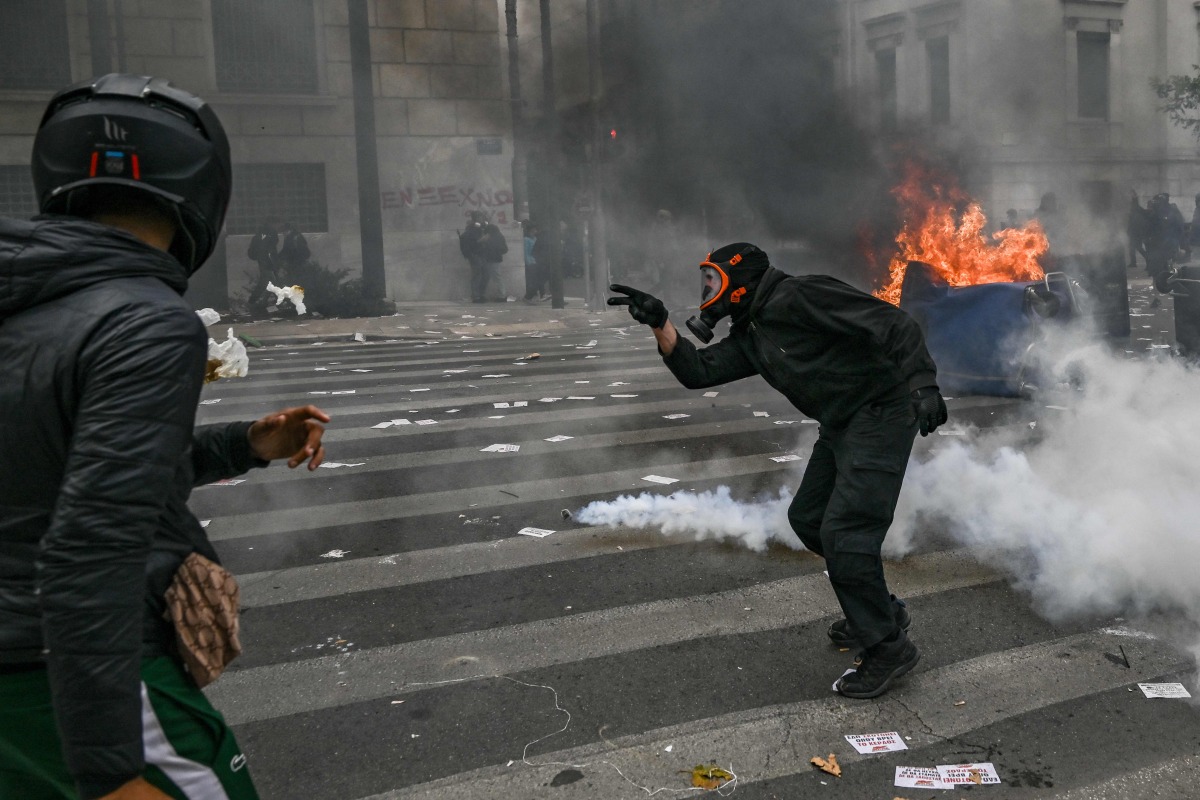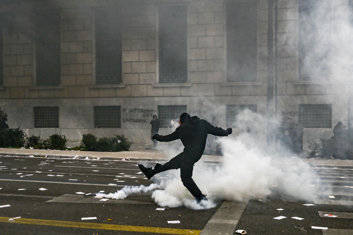 A protester kicks a molotov towards riot police as clashes break out during a rally as part of a general strike called by unions to mark the second anniversary of the country's worst rail tragedy that left 57 dead on February 28, 2023, in front of the Greek parliament, in Athens on February 28, 2025. Photo by Aris MESSINIS / AFP