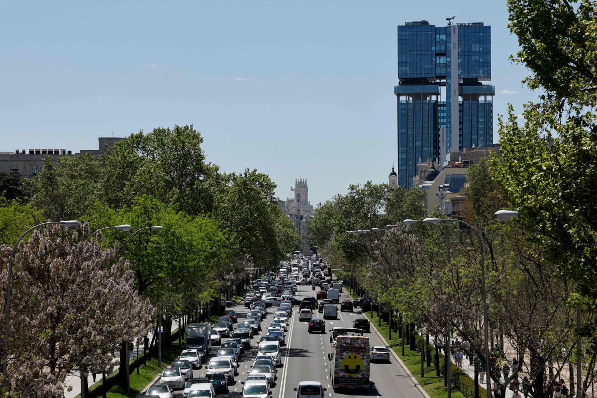 This photograph shows cars traffic under switched-off traffic lights on Paseo de la Castellana with Torres Colon in the background in Madrid on April 28, 2025, during a massive power cut affecting the entire Iberian peninsula and the south of France. Photo by OSCAR DEL POZO / AFP