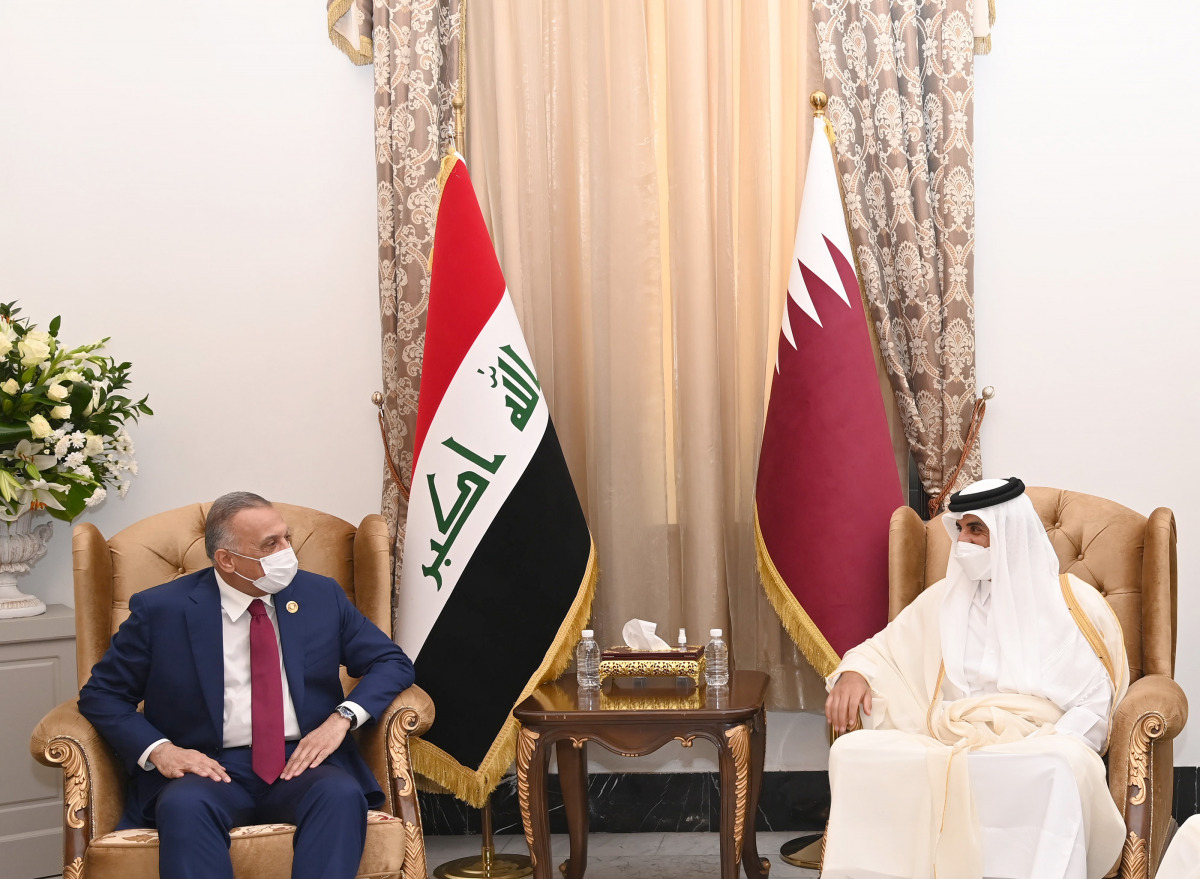 Baghdad: The Amir HH Sheikh Tamim bin Hamad Al-Thani met today with HE Prime Minister of the Republic of Iraq Mustafa Al Kadhimi, on the sidelines of the Baghdad Conference for Cooperation and Partnership at the headquarters of the Prime Minister of the Republic of Iraq.