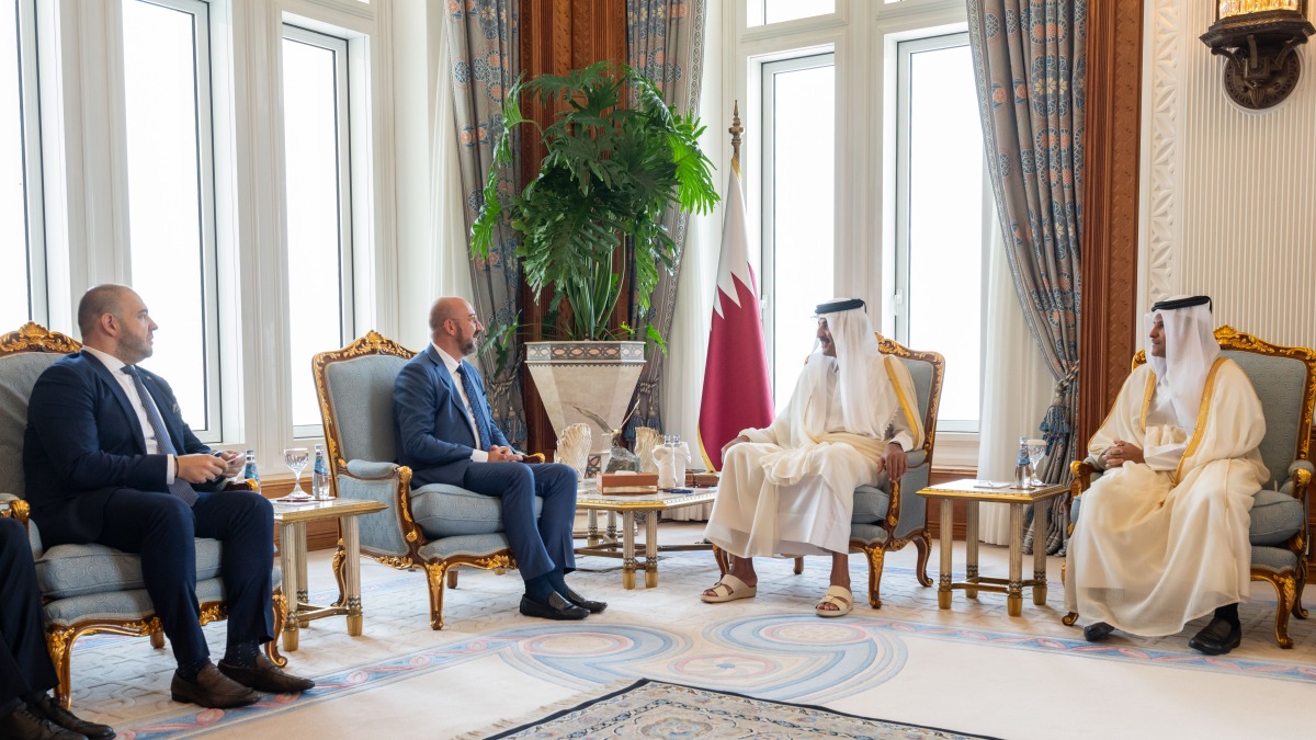 Doha, Qatar: The Amir HH Sheikh Tamim bin Hamad Al Thani met at his Amiri Diwan office on Wednesday morning with HE President of the European Council Charles Michel and the accompanying delegation.