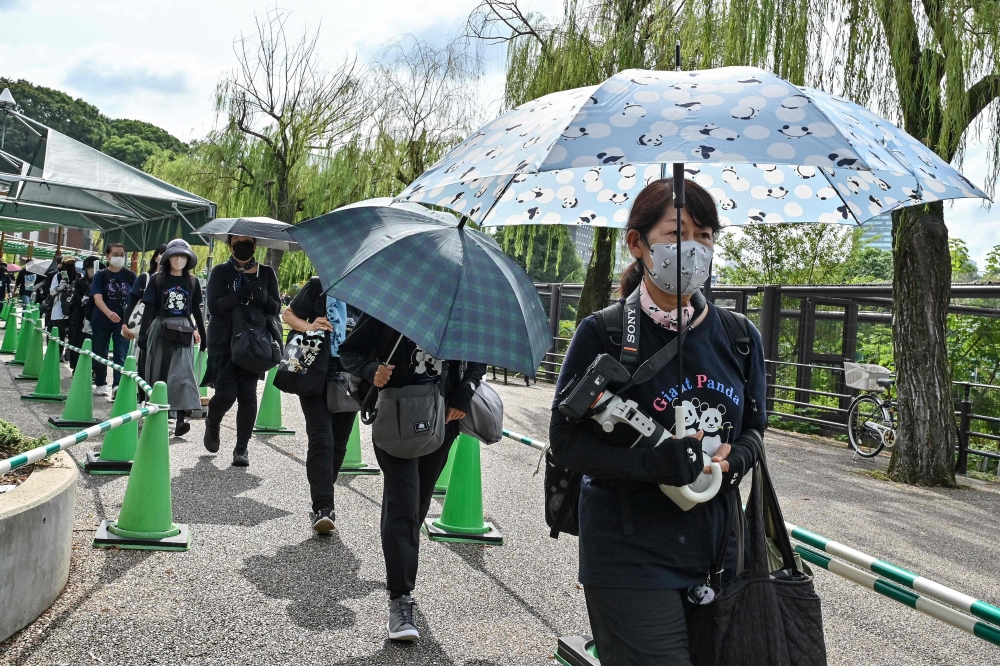 Panda fans walk in a queue as they arrive on the last day of viewing to see two pandas at Tokyo's Ueno Zoo on September 28, 2024. (Photo by Richard A. Brooks / AFP)