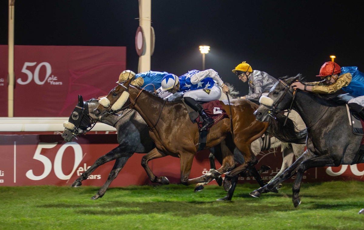 Owned by Sheikh Abdul Rahman bin Rashid Al-Thani and trained by Mohammed Al Ghazali, the gelding was settled patiently before Soufiane Saadi unleashed him in the home straight. Aeon’s Aegis swept past his rivals one by one, hitting the front 100m from the line and scoring impressively by five lengths, giving Saadi a quick-fire double to end the evening.
