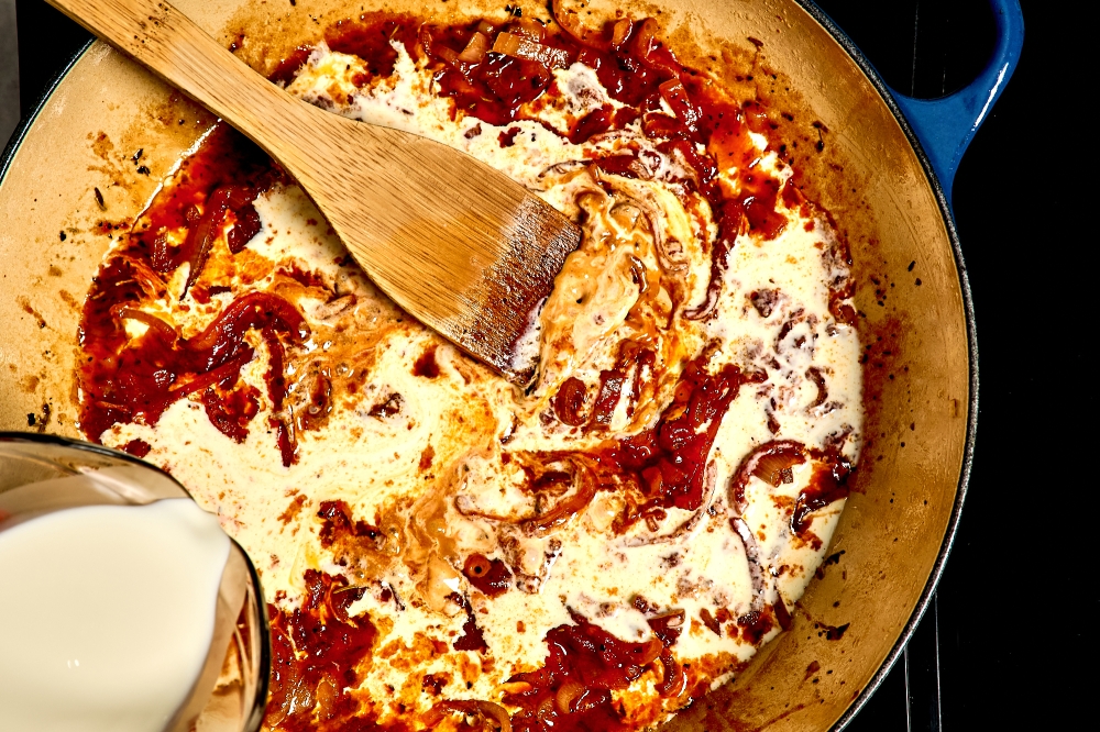 A couple tablespoons of tomato paste add a boost of umami, plus sweetness and acidity, which are buoyed by dry spirits that gets reduced to concentrate the flavor. Heavy cream finishes the luscious sauce, to which the chicken is added to finish cooking all the way through. A sprinkling of chopped parsley adds a verdant, refreshing flourish.