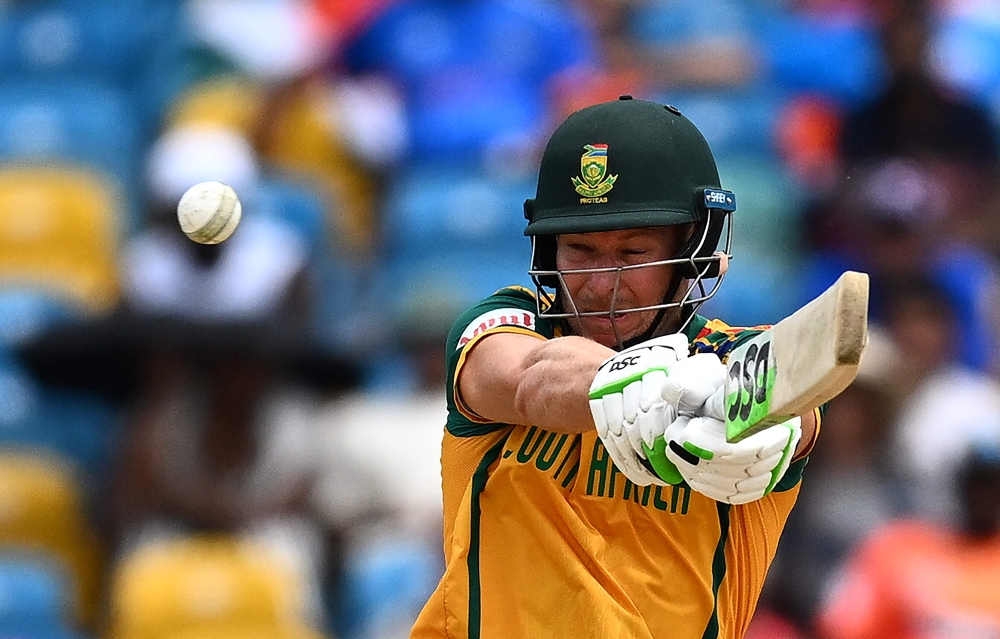 South Africa's David Miller hits a shot during the ICC men's Twenty20 World Cup 2024 final cricket match between India and South Africa at Kensington Oval in Bridgetown, Barbados, on June 29, 2024. (Photo by Chandan Khanna / AFP)