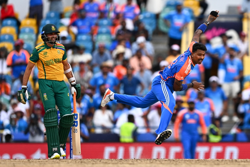India's Hardik Pandya (R) bowls during the ICC men's Twenty20 World Cup 2024 final cricket match between India and South Africa at Kensington Oval in Bridgetown, Barbados, on June 29, 2024. (Photo by Chandan Khanna / AFP)
